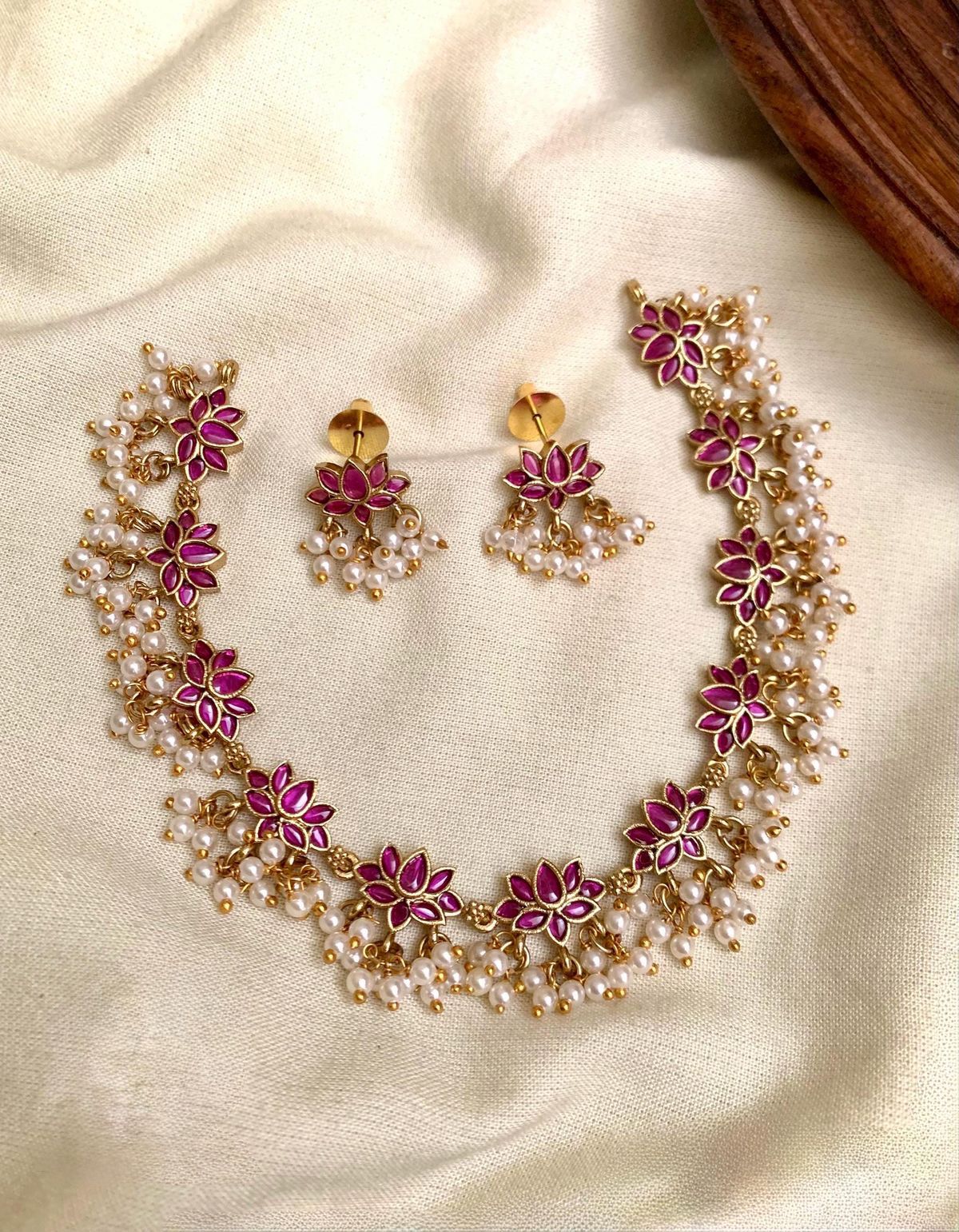 Gold toned and antique necklace material and stone type: pink stones with pearl hanging with lotus pattern.