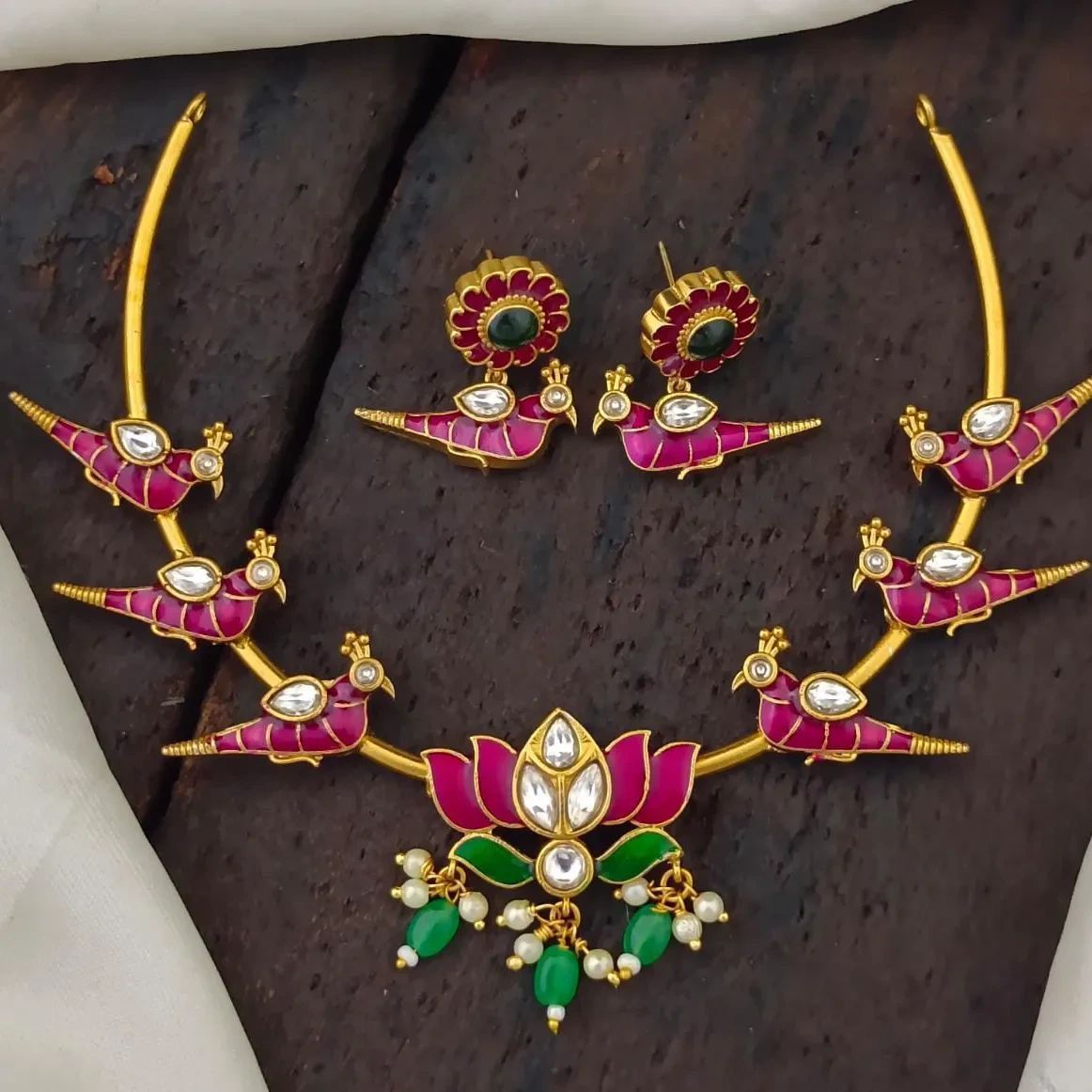 Gold toned and antique necklace material and stone type: Big red and green stones with bird and lotus pattern